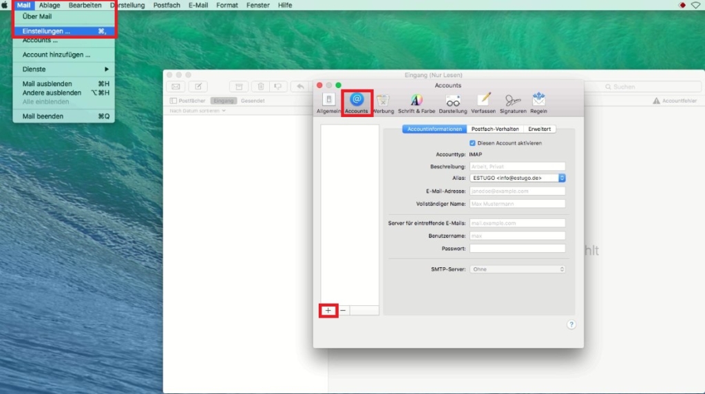 Zum erstellen eines neuen Kontos klicken Sie auf „Mail“, dann auf „Einstellungen“. Im Reiter „Accounts“ können Sie nun unten links auf das Symbol „+“ klicken.