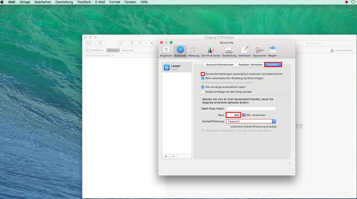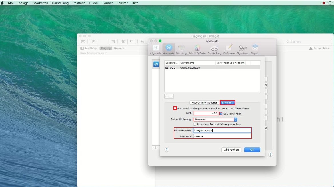 – Accounteinstellungen automatisch erkennen und übernehmen: nein