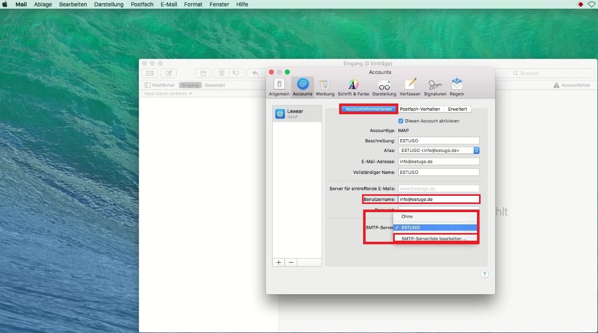 Als erstes bearbeiten Sie bitte den Postausgangsserver unter „SMTP-Serverliste bearbeiten“.