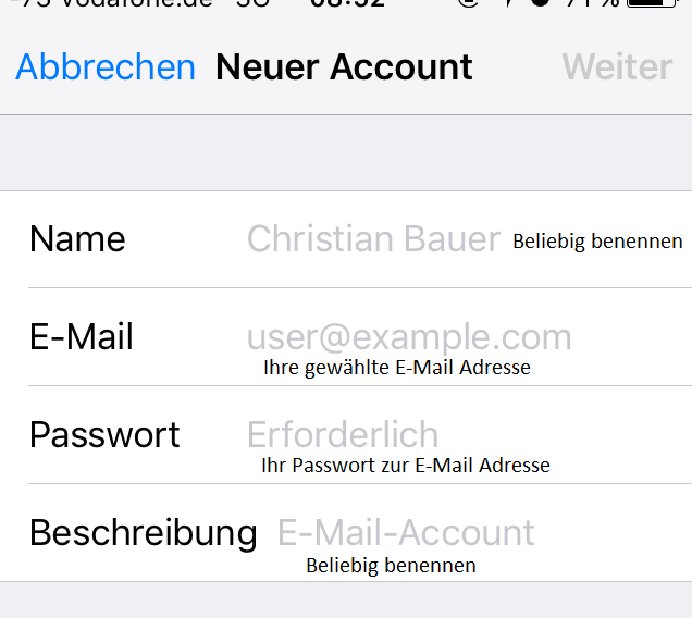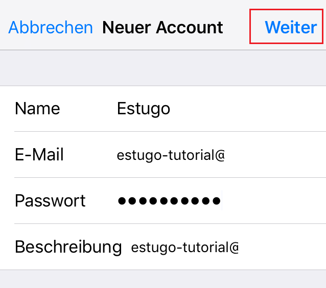 Tragen Sie nun Ihren Namen, die zu nutzende E-Mail Adresse, dass dazugehörige Passwort und eine beliebige Postfach-Beschreibung ein. Nach Befüllung tippen Sie bitte auf den Punkt „Weiter“. Dieser befindet sich in der Regel oben rechts.