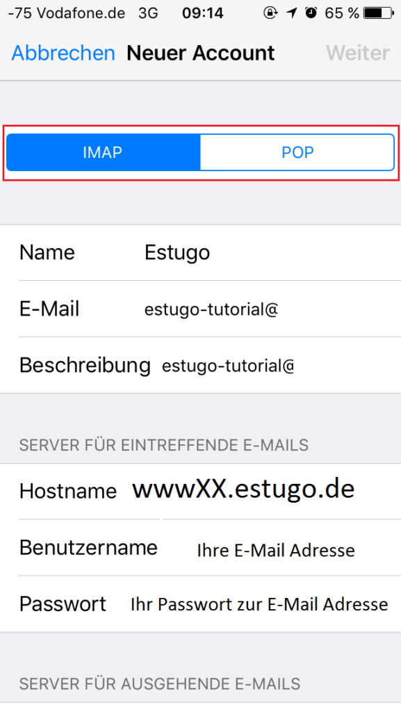 Server für eingehende E-Mails: Servername (z.B.: wwwXX.estugo.de)