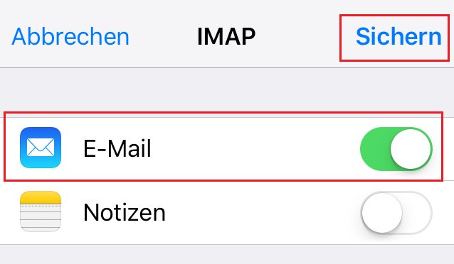 Wenn alle Einstellungen korrekt sind und diese durch Ihr Gerät geprüft wurden, wählen Sie im folgenden Bildschirm, wie auf dem Bild zu sehen, den Punkt „E-Mail“ aus und tippen dann auf „Sichern“.