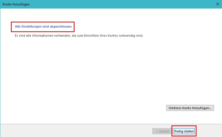 Outlook 2016 meldet die erfolgreiche Einrichtung. Mit einem Klick auf „Fertig stellen“ beenden Sie die Einrichtung.