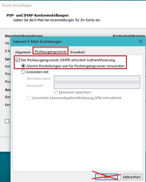 – Der Postausgangsserver (SMTP) erfordert Authentifizierung