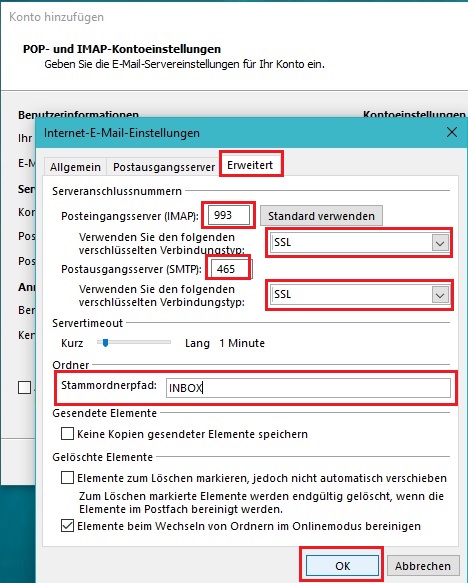 – Port Postausgangsserver: SMTP mit SSL Verschlüsselung = 465