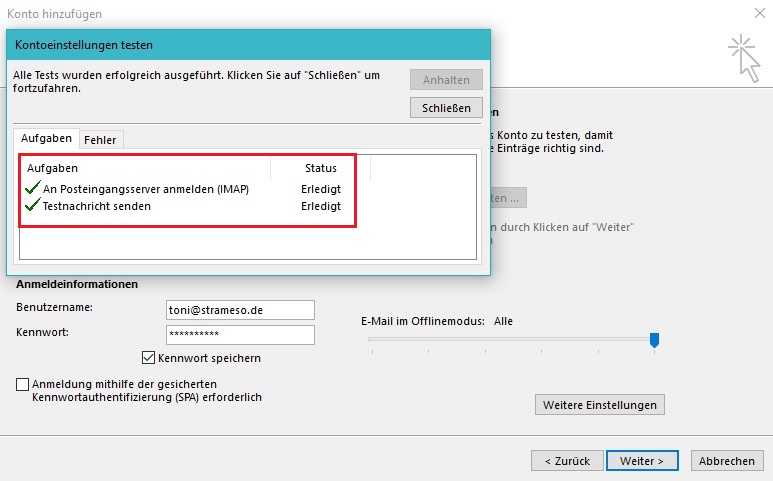 Outlook 2016 prüft nun den Postein- und Postausgangsserver. Es öffnet sich dafür ein neues kleines Fenster mit 2 Aufgaben. Wenn Sie zwei grüne Haken sehen, waren alle Tests erfolgreich. Klicken Sie nach erfolgreicher Prüfung auf „Schließen“.