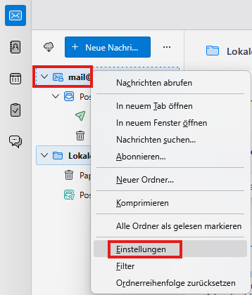 Machen Sie im Thunderbird einen Rechtsklickt auf Ihre E-Mail-Adresse und wählen Sie dann Einstellungen.
