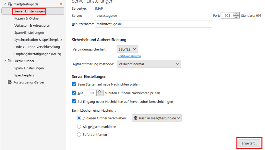 Gehen Sie dann bei Ihrer E-Mail-Adresse auf Servereinstellungen und dort auf Erweitert.